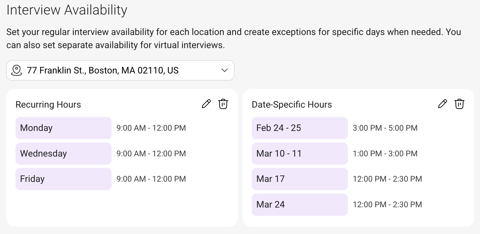Your recurring hours and date-specific hours can be adjusted by going to Settings > Interviews > General > Interview Availability: