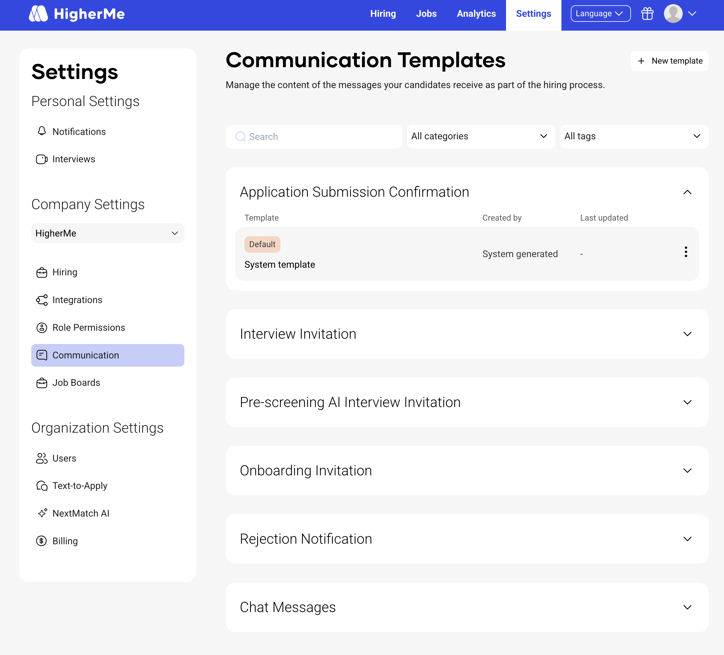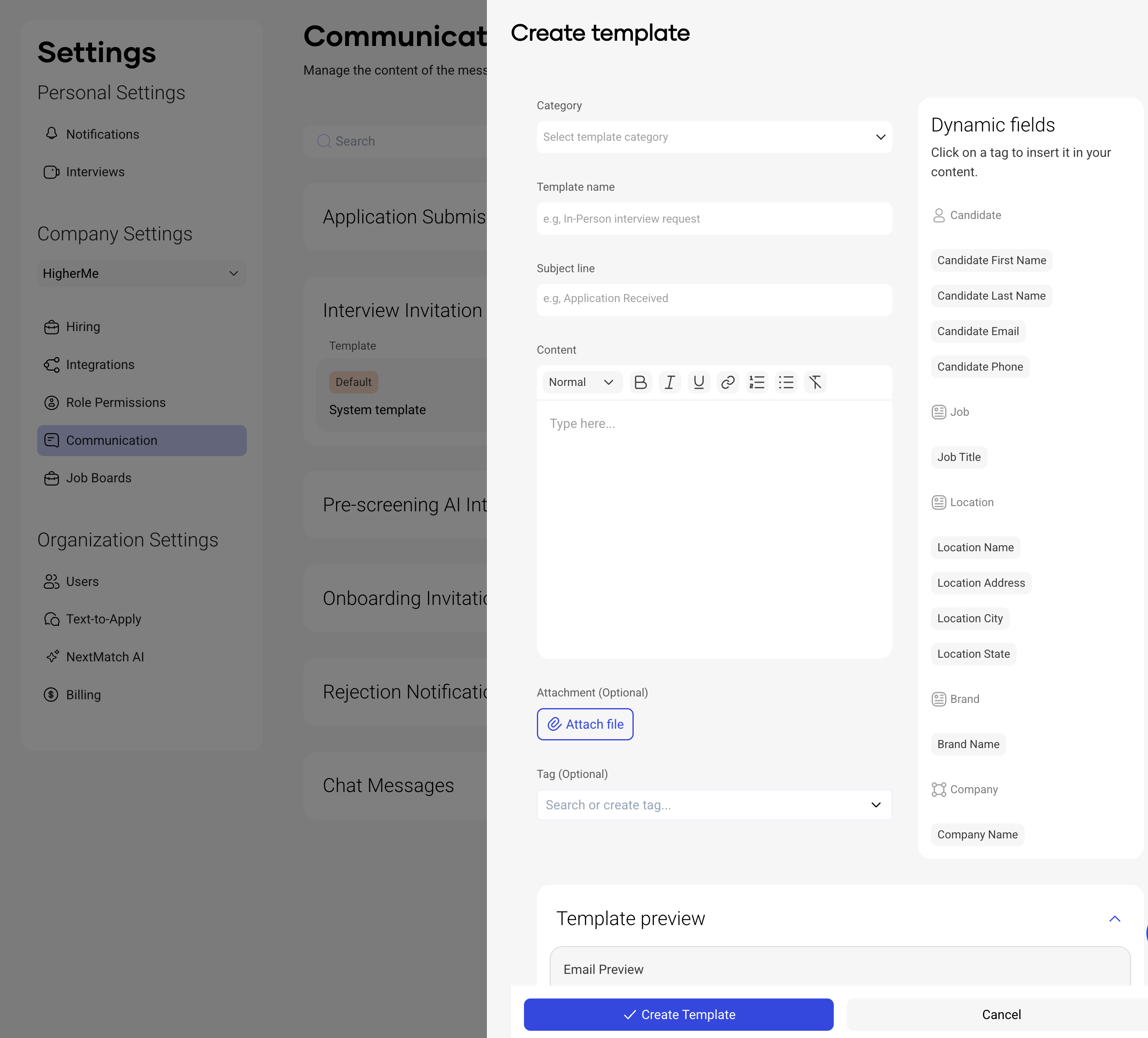 Communication templates are prewritten messages that are automatically sent when certain hiring actions happen — like rejecting a candidate or inviting someone to interview.