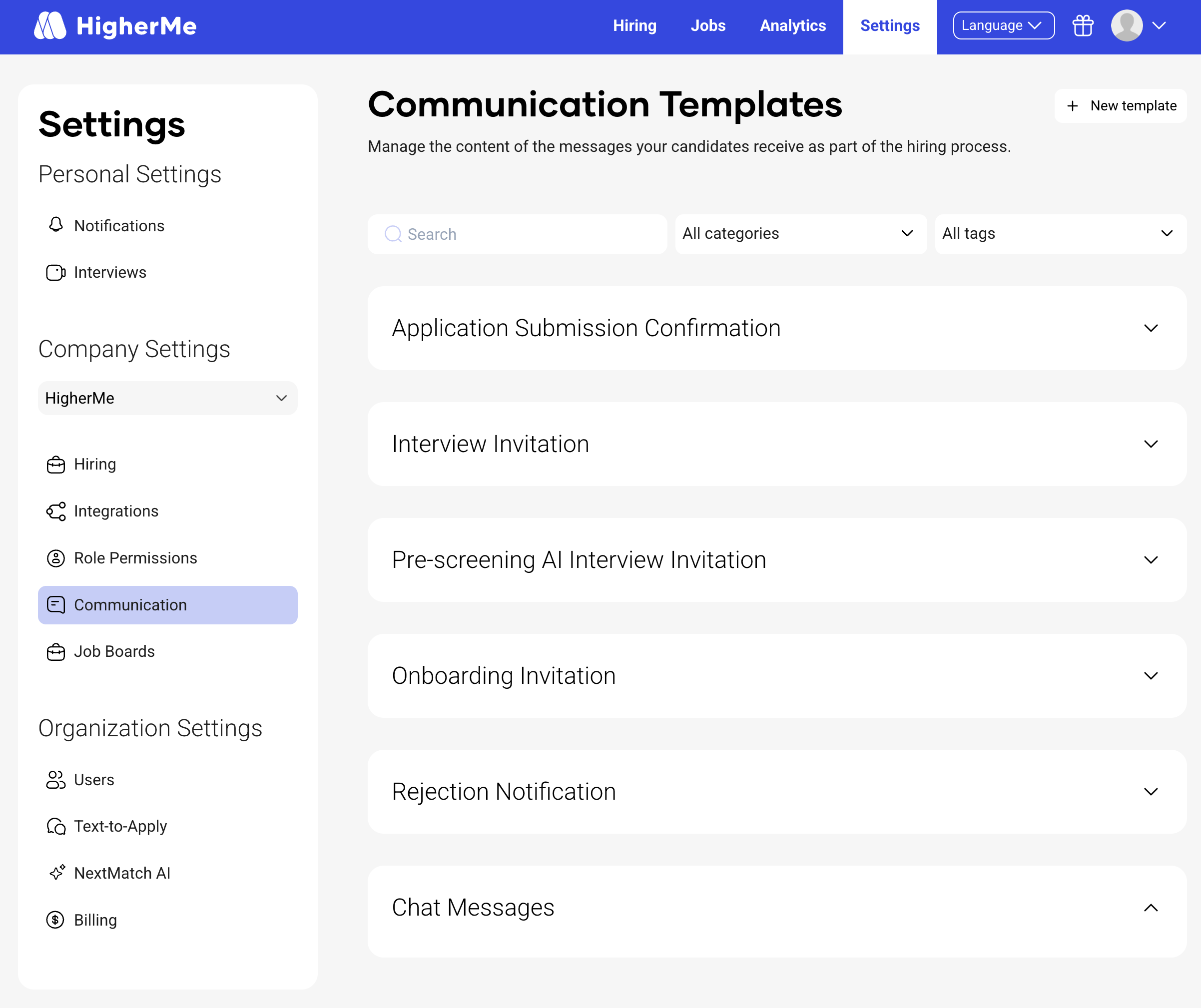 Communication templates help you send consistent, professional messages to candidates throughout your hiring process. With self-service template management, Company Administrators can now create and manage their own messaging directly in Hiring Hub — no back-office setup required.